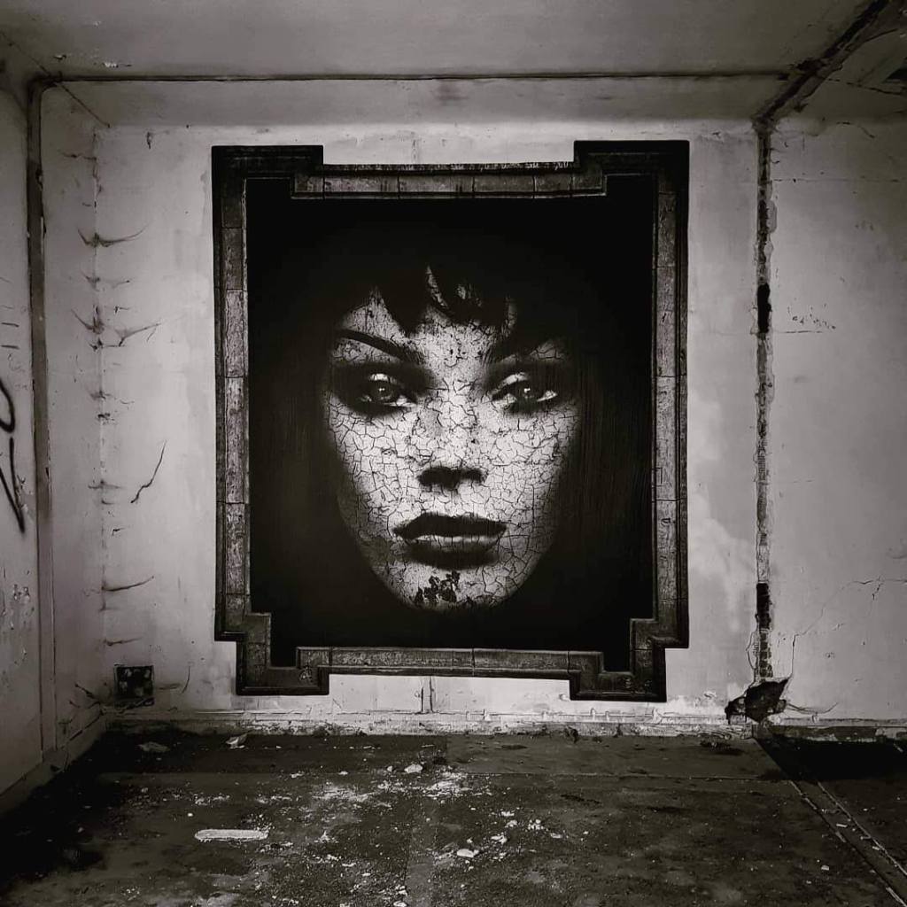 And only then do we begin to realize the spell she has cast. This perfect image—what is it, exactly? A painting? A collage? A charcoal drawing? This deep, enveloping black, uniting our world with hers—where does it come from? There’s nothing to give it away. No fold in the paper, no seam, no printing dot. Nothing. Softtwix crafts her work like an alchemist, keeping her methods secret to leave only sensation—the feeling of encountering “the human” in all its poetic fragility, within the temporary temple she has granted it, where we stand trembling—struck as much by the grace of the image as by the gesture behind it. And that feeling—like the work itself—is utterly unique to her. No matter the place—a city wall, a festival, an urbex site—you leave enchanted, often with a photo in hand, smiling to yourself: I’ve seen a Softtwix…