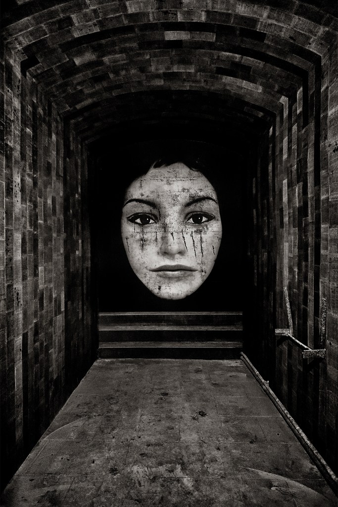 First, there are these magnetic faces, emerging from unexpected chiaroscuro, suspended in the shadowy depths of architecture. Whether inside a medieval church or an abandoned industrial wasteland, the portraits of Softtwix stare, question, and quietly scrutinize the viewer, who—facing these immobile giants—struggles to find their place. Who is looking, and who is being looked at? Out of this unsettling ambiguity, poetry arises—an instant of magical encounter between seer and seen, each unsure of their role. However monumental their scale—growing larger over the years—these faces remain gentle, yet carry an aloof, hieratic presence, out of time and space. Locked in their gaze, the visitor slowly loses themselves. The surrounding architecture—shadowed archways, framing walls—becomes a threshold, bridging the gap between the real and the imaginary, between our dimension and that fleeting one conjured by the artist.